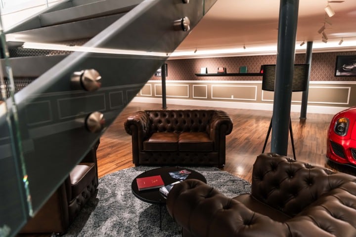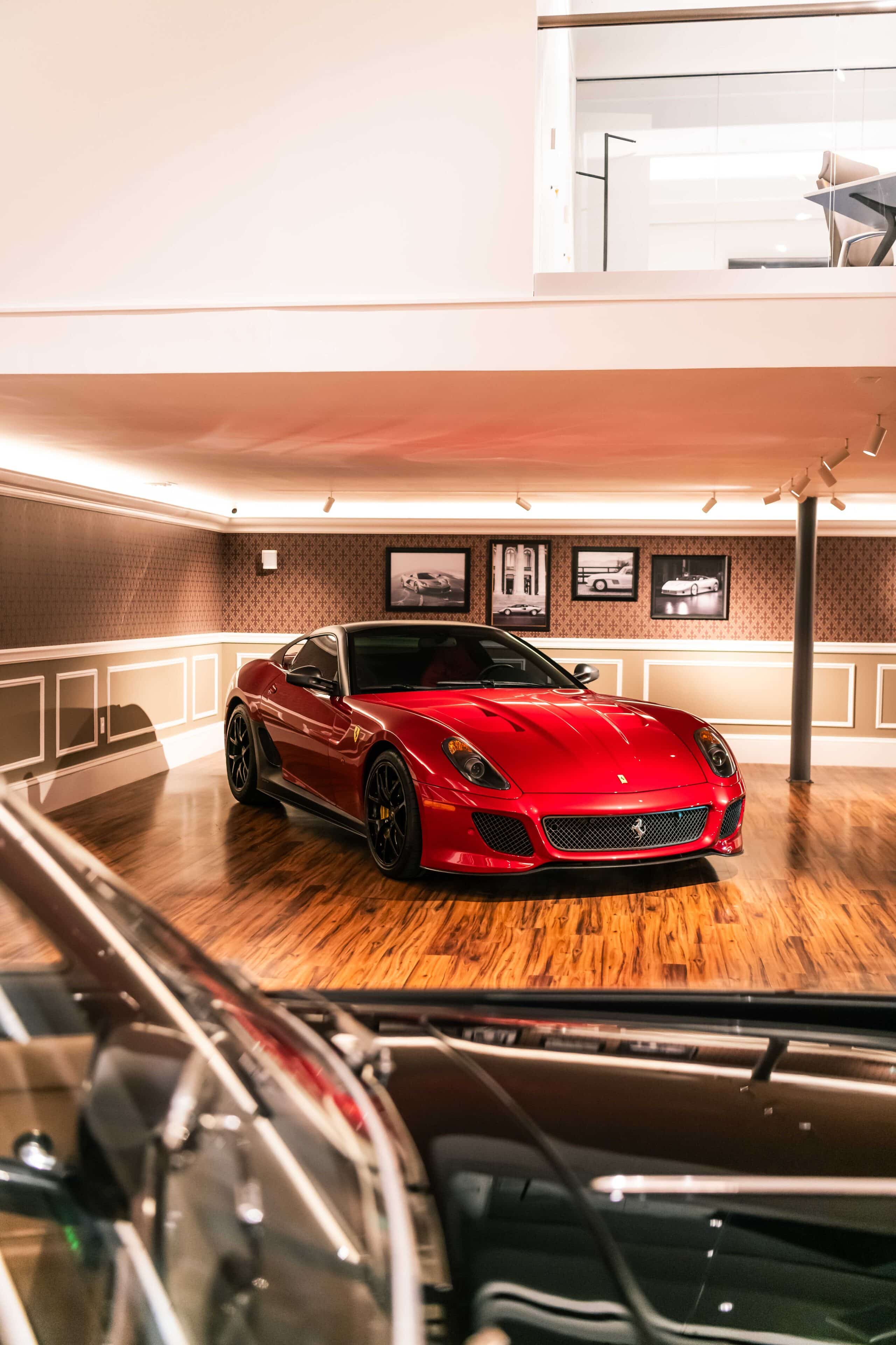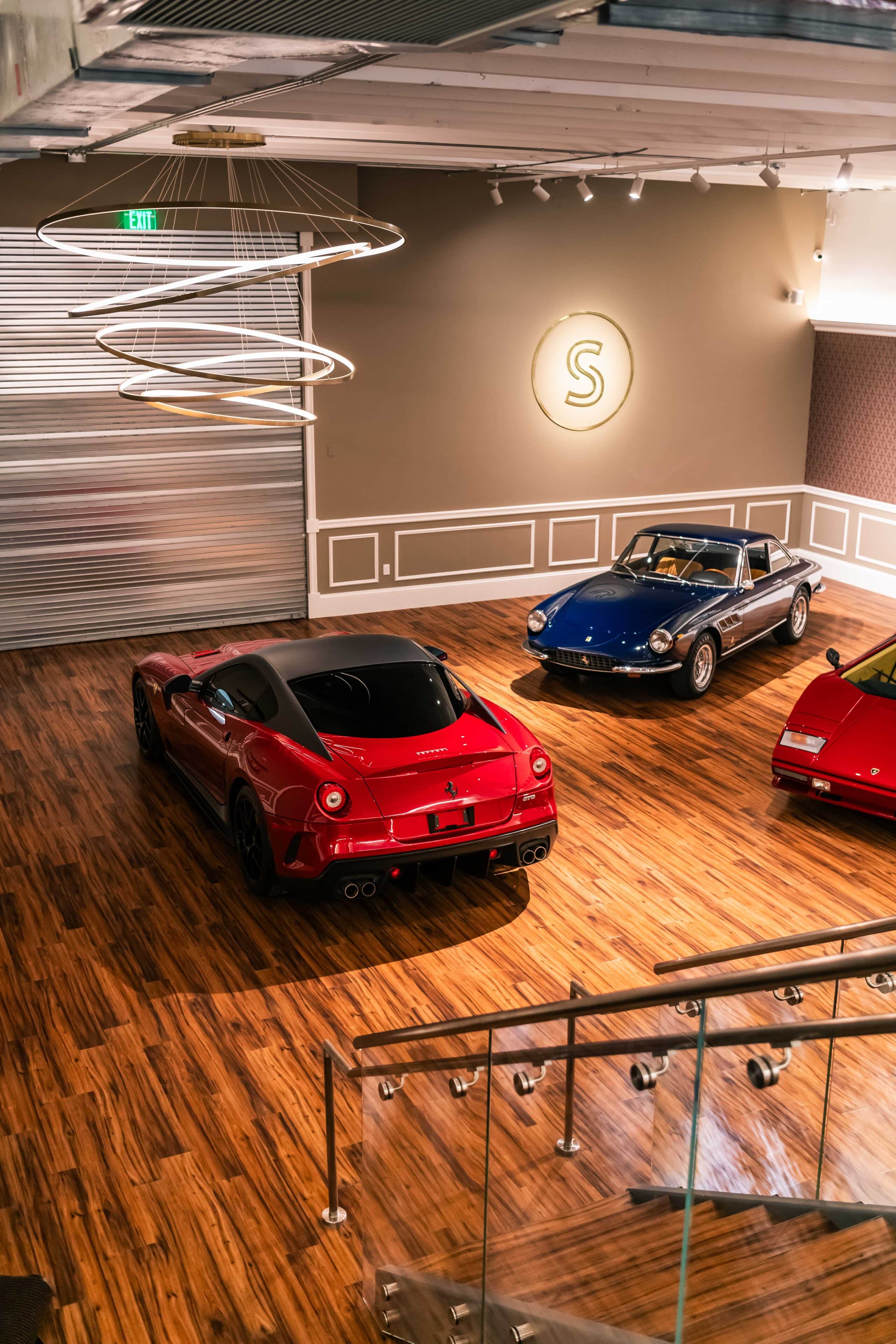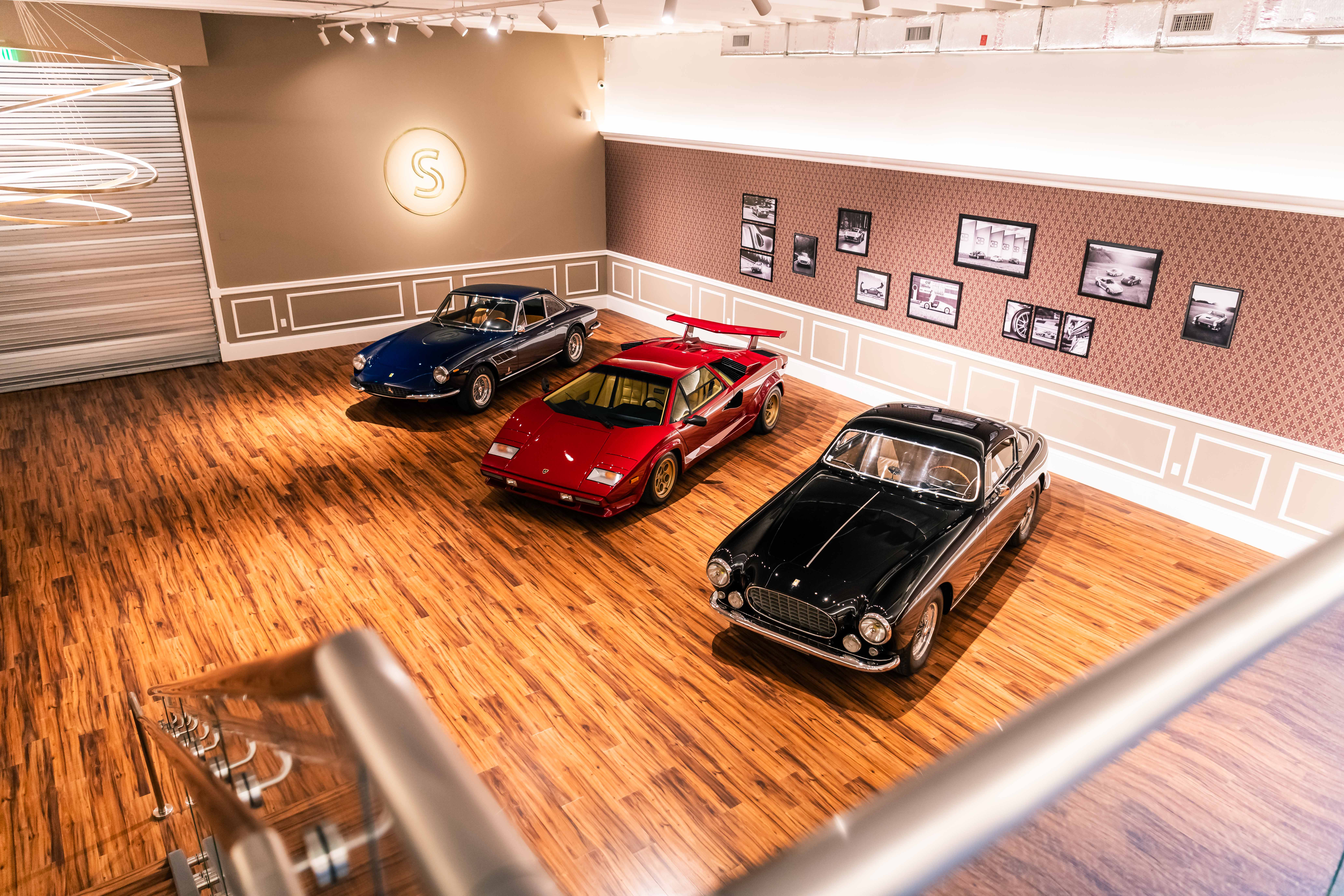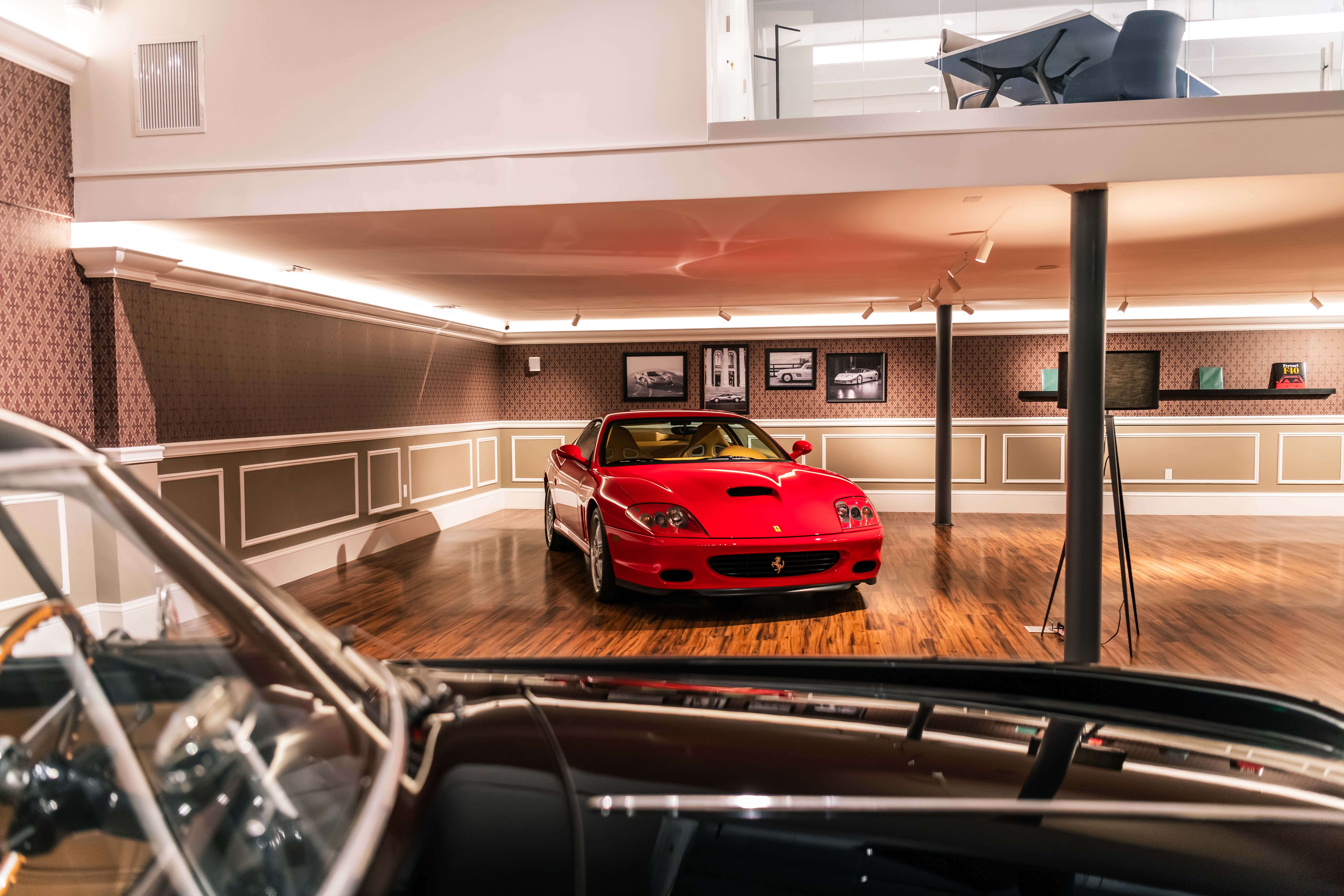 The renovation introduces a newly constructed loft, creating a dedicated workspace that overlooks the showroom below. The main floor is finished in warm wood planks, grounding the space with natural texture while showcasing the collection of luxury automobiles in an understated yet sophisticated setting. A custom-designed hospitality bar anchors the lounge area, paired with leather-upholstered furnishings, a curated library wall, and atmospheric lighting—inviting clients to linger and engage.