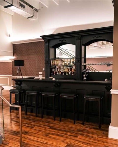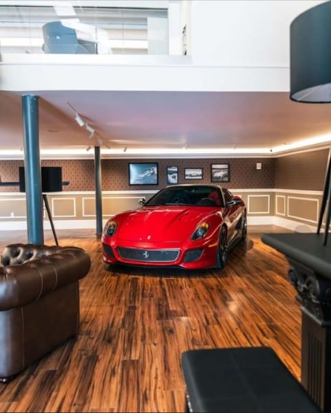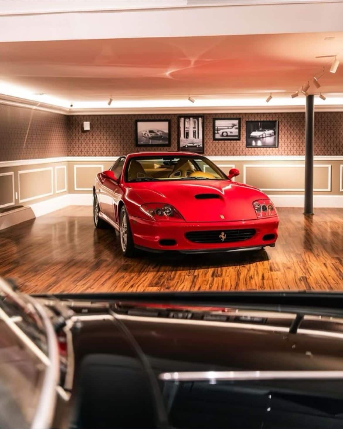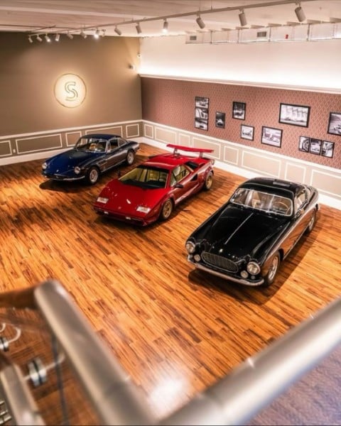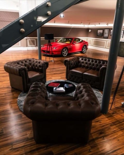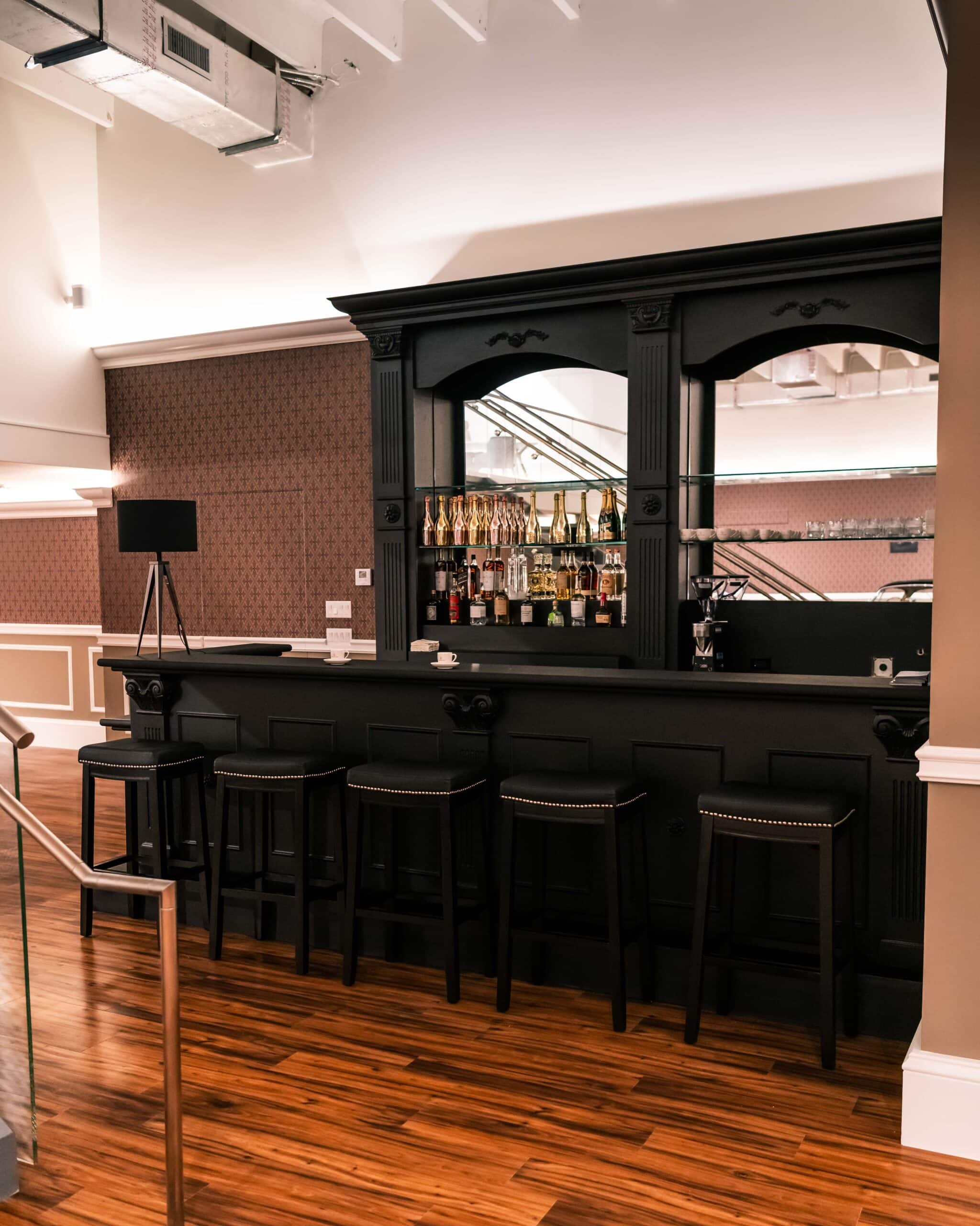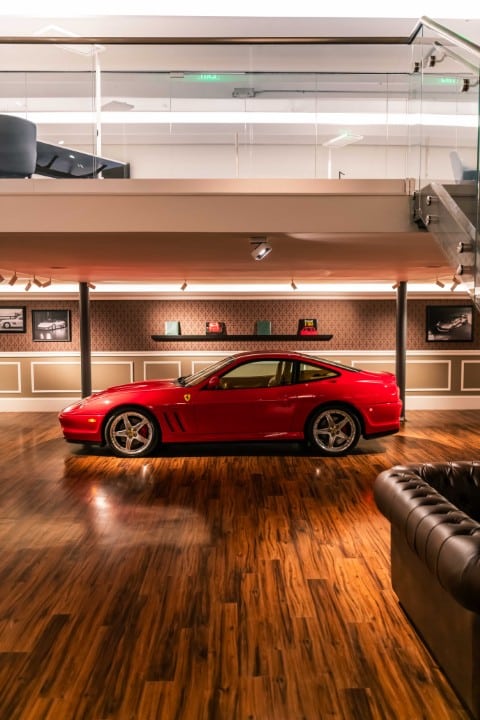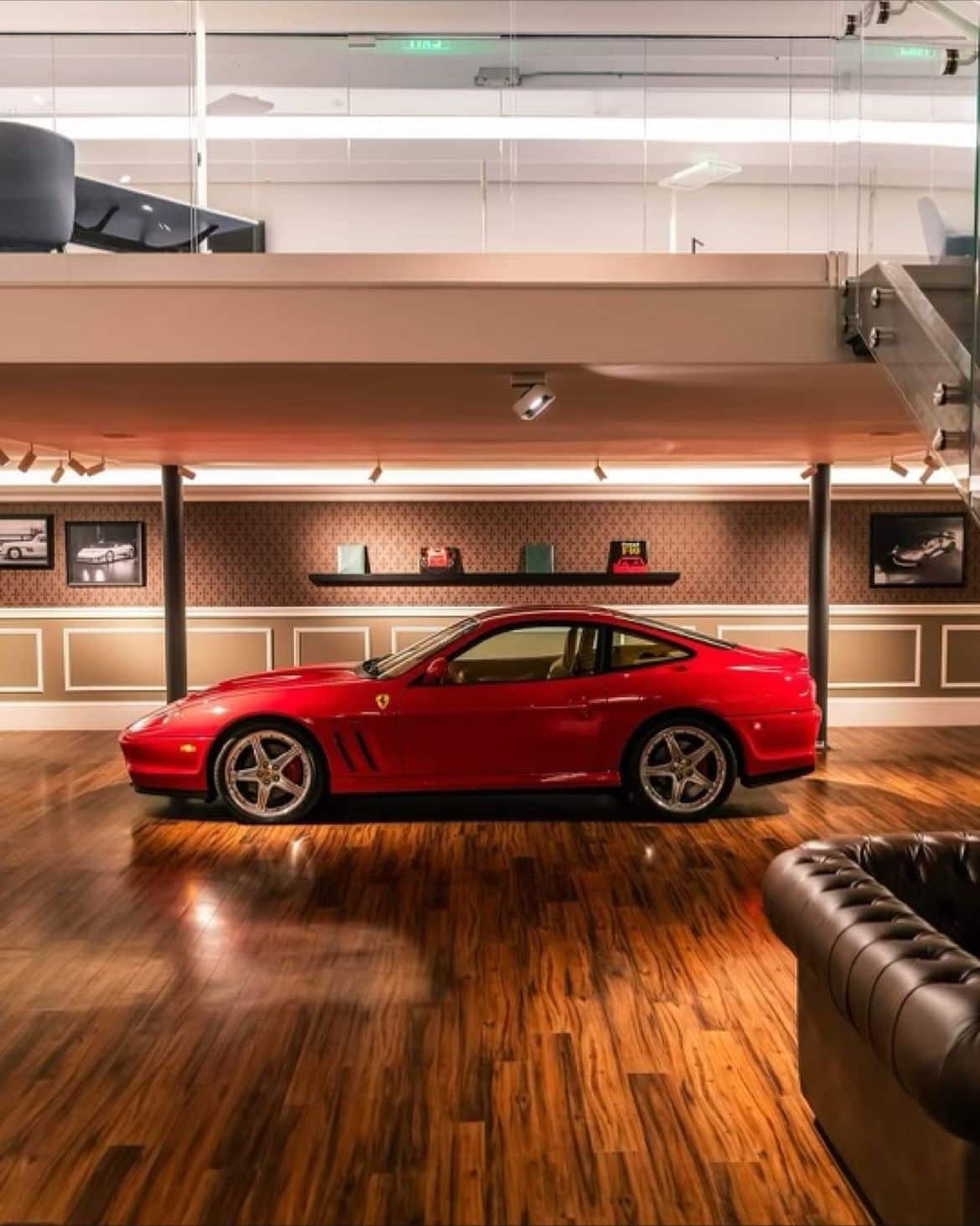 The renovation introduces a newly constructed loft, creating a dedicated workspace that overlooks the showroom below. The main floor is finished in warm wood planks, grounding the space with natural texture while showcasing the collection of luxury automobiles in an understated yet sophisticated setting. A custom-designed hospitality bar anchors the lounge area, paired with leather-upholstered furnishings, a curated library wall, and atmospheric lighting—inviting clients to linger and engage.