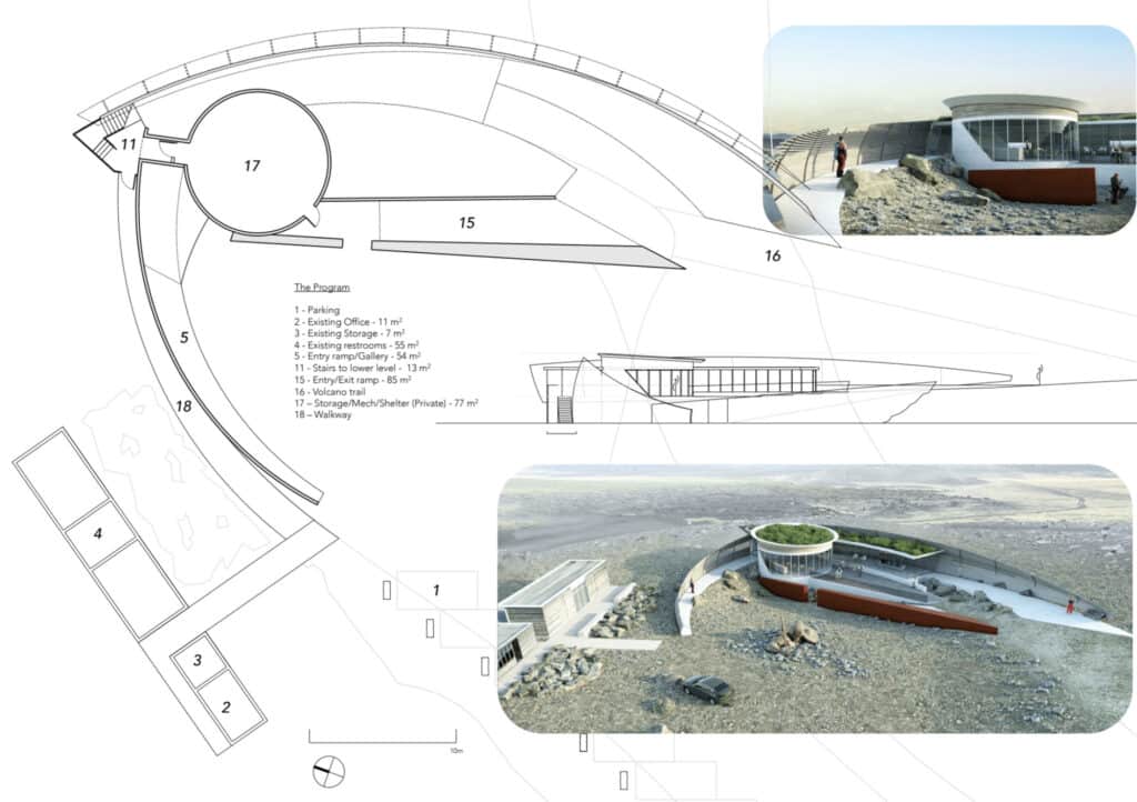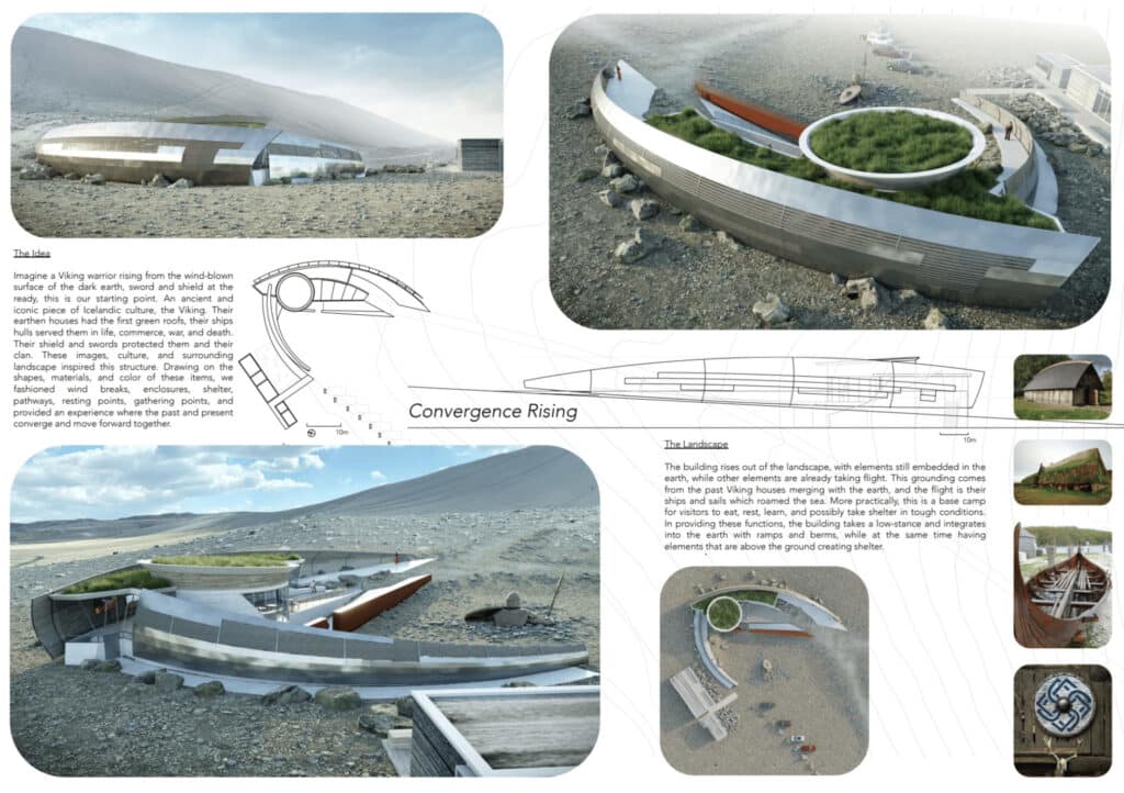 Rooted in Iceland’s volcanic earth and Viking heritage, the visitor center rises from the landscape like a warrior from myth—sword, shield, and sail embodied in form and material. Drawing inspiration from the green roofs of earthen homes, the hulls of seafaring ships, and protective armaments, the design blends culture and function to create wind breaks, pathways, shelters, and gathering points. This building is not just a structure—it’s a gesture that honors the past while offering an experience grounded in the present and oriented toward the future.