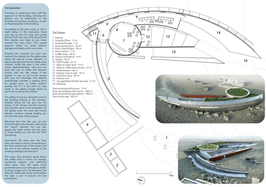 The center is carefully embedded in the terrain, its low-slung berms and ramps recalling Viking houses merging with the land , while arcing steel elements evoke the lift of ships at sea. Inside, a sculptural entry ramp leads visitors into a curated sequence of spaces: a gallery tracing the volcano’s story, a coffee shop with a panoramic terrace, and flexible gathering areas for orientation, shelter, or rest. Visitors move through and around the building as they would a landscape, entering, exploring, and returning via subtly integrated paths and ramps shaped like sword blades and ship curves.